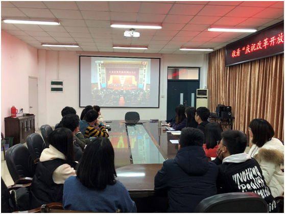 2018年12月18日上午,庆祝改革开放40周年大会在北京人民大会堂隆重举行,表彰了一批为改革开放做出杰出贡献的改革先锋人员,习近平总书记在大会上发表重要讲话。为学习习近平总书记讲话精神,进一步了解和学习改革开放伟大进程,下午,环境与资源学院于嘉锡楼314会议室组织学生干部收看“庆祝改革开放40周年大会”直播视频并组织学习座谈会。会议由环境与资源学院团委书记黄永斌老师主持。